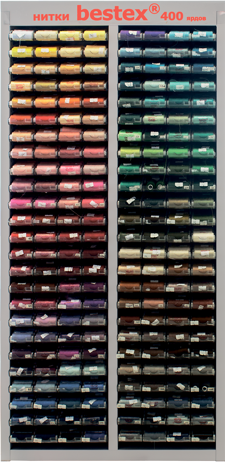 Нитки Bestex 40/2, *400 ярд. – эксклюзивное предложение компании Айрис. Универсальные швейные нитки из полиэстера высокой прочности и низкой степени растяжения. Подходят для работы с любым видом тканей; для бытовых швейных машин. В ассортименте представлено 400 цветов. Постоянное наличие на складе всех цветов. Для представления полного ассортимента вам потребуется два шкафа-стенда